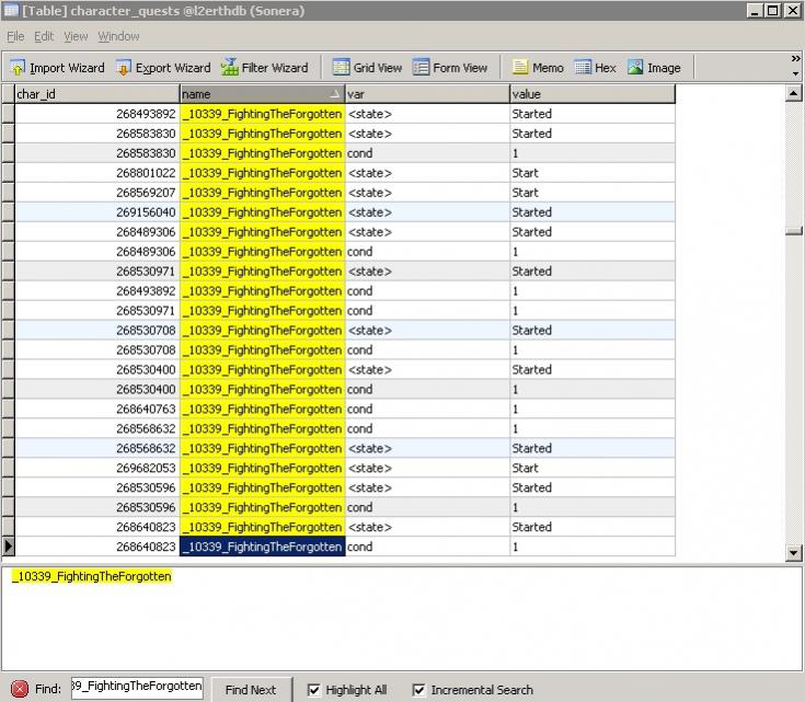[00:29:22] INFO Project Revision: ........ L2s [14244] [00:29:22] INFO Build Revision: .......... 3962 [00:29:22] INFO Update: .................. Epic Tale of Aden: Ertheia [00:29:22] INFO Build date: .............. 2014.12.29 02:33 [00:29:22] INFO Compiler version: ........ 1.7.0_67-b01 (Oracle Corporation) [00:29:22] INFO ================================================= Перс перерожденный. Сравнивал с файлами Линдвиора - все идентично. Но, квест не проходится. Если просто нафармить 12 мобов тоже результата нет. Квест не работает. http://l2central.info/wiki/Оковы_прошлого Цитата: