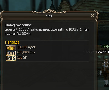 [19:23:35] INFO Project Revision: ........ L2s [17045] [19:23:35] INFO Build Revision: .......... 5063 [19:23:35] INFO Update: .................. Epic Tale of Aden: Infinite of Odyssey [19:23:35] INFO Build date: .............. 2015.07.17 17:13 [19:23:35] INFO Compiler version: ........ 1.8.0_45-b14 (Oracle Corporation) [19:23:35] INFO ================================================= http://l2central.info/wiki/Влияние_Сакума Вы сломали квест. В общем, сейчас условия в java не пропускают персонажей на квест, даже если они полностью соответствую им (я вижу что квест не для Артей). Вместо этого, вываливается: http://forum.l2-scripts.ru/attachmen...1&d=1438614971 Как сюда затесался этот диалог, одному вашему квест мейкеру известно. В общем откатил на старую версию квеста. И да, исправьте пожалуйста на "с 28 по 40 лвл"... |