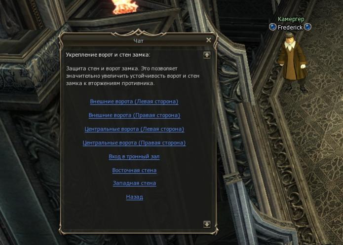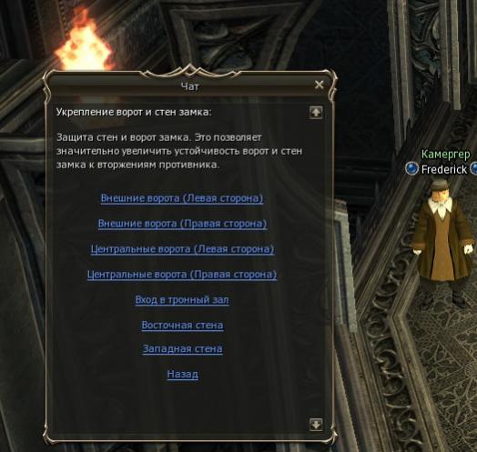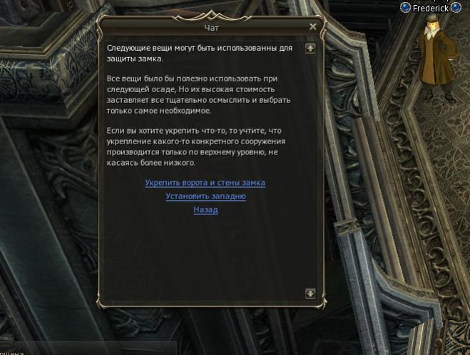 Осада продолжается (хоть на замок никто не регистрировался, есть только владелец). НПЦ в замке не общаются, пишут "война началась", Боевой зоны в замке нет (!), гуарды (которые я смог высставить) распаковались. Ловушки не работают (писал в предыдущей теме). Ворота так же не работают - ибо осада. У всего клана значок защиты...