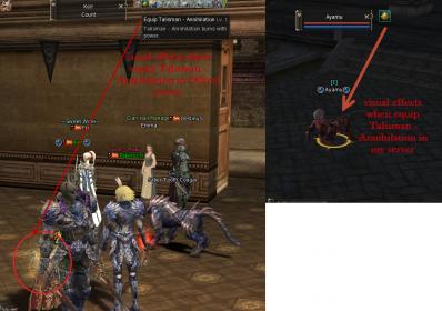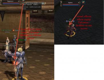 i have the visual effect when equip talisman - annihilation in offical server and our server (as file 01 ) and talisman - hellfire (as file 02)