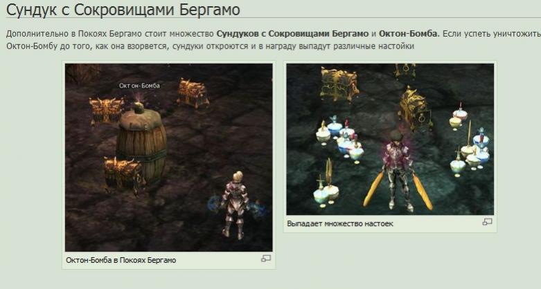 Проверил после "исправления" Октон бомба ваще не убивается , да у нее и нр нет и всего остального. тупо ждешь когда она пропадет и все, здесь она не выполняет сути своей. Если убить ее до того как она типа взорвется то откроются сундуки с дропом. У нас же она пропадает сама по себе через секунд 30-40, а сундуки открываются или игроком или так же пропадают через 2 минуты без ничего , то есть октон бомба кроме картинки НЕРЕАЛИЗОВАНА никак ОТката на пространственные врата нет. Можно стоять весь день и заходить весь день ( в случае успешной реализации покоев бергамо) и разживаться итемами сУНДУКИ нАДЕЖДЫ, Удачи и Судьбы стоят для вида - дропа в них нет - дроплист отсутствует Из 8 заходов в покои бергамо с сундуков не выпало ни одного итема вообще, да и как они выпадут если сделано КРИВО (пока криво) Пространственный сундук (ИД 33701) Показывает 76 лвл (пускает 99лвл) но тем не менее требует исправления ибо опять же криво Последний раз редактировалось ankam26; 04.07.2013 в 11:44. |