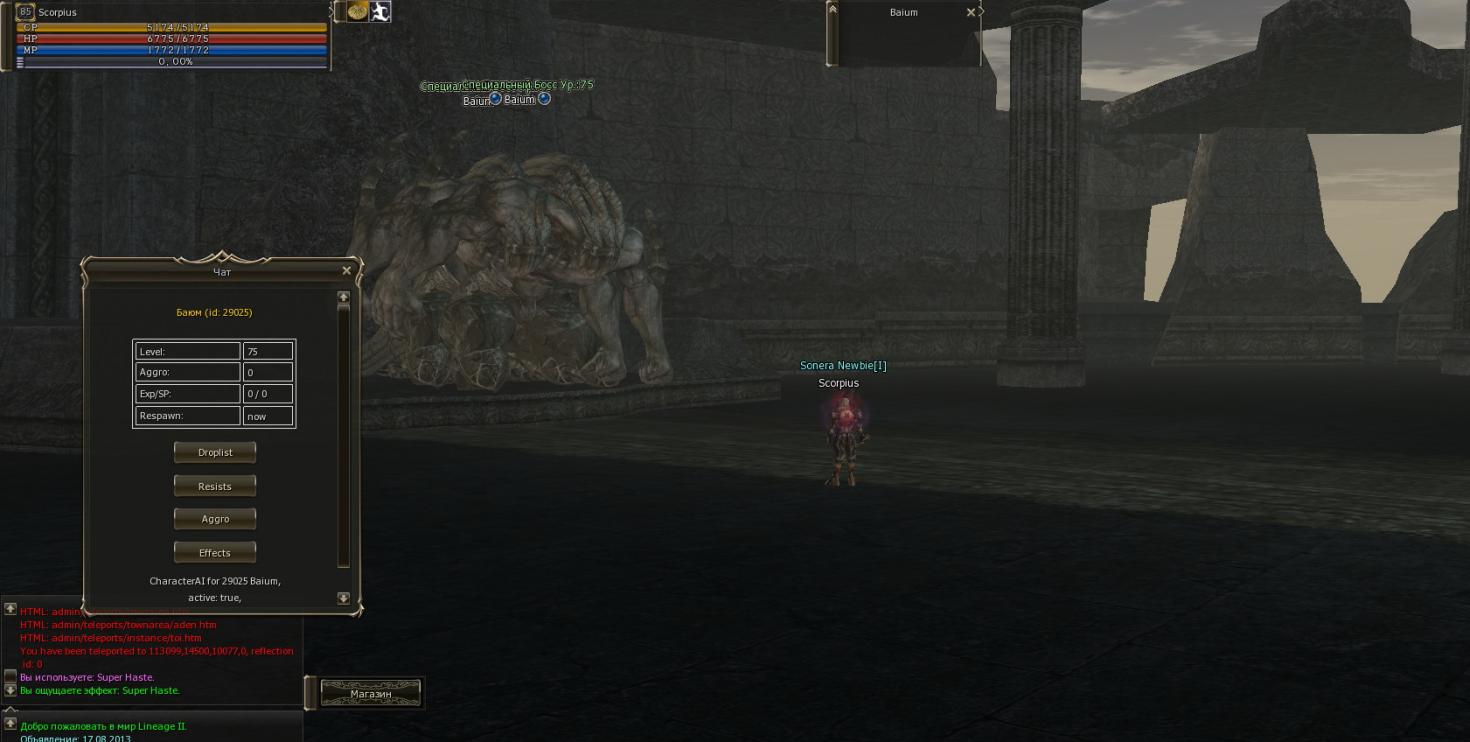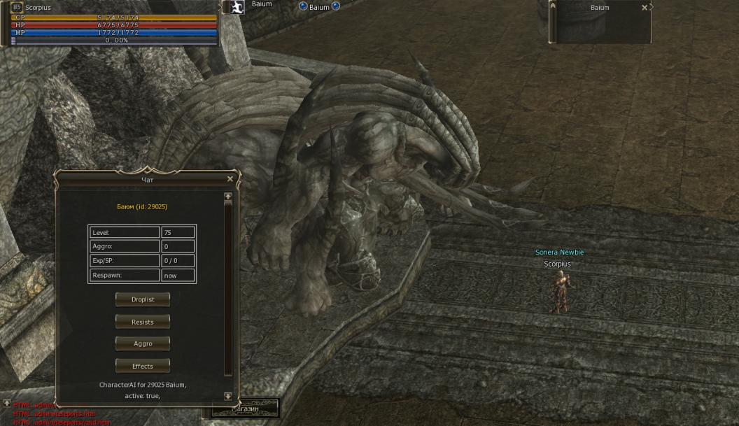 В общем весьма странная картина постигла меня утром (см. скрин). Вопрос: зачем в папке spawn лежит файл boss.xml с единственным спавном Баюма, с координатами ГМ комнаты? Я удалил этот файл и - аллилуя, Баюм заработал. Кристал пустил, Баюм проснулся. Единственно чет я его ударить не смог, но у меня не было времени, на работу торопился... В общем, жду от вас комментарии и как можно скорее... |
