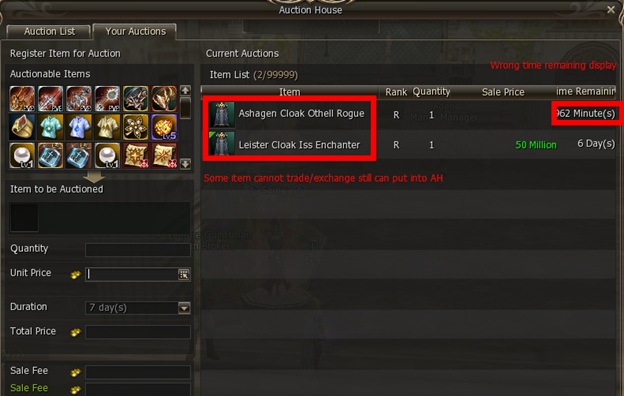 [5:00:42] INFO Project Revision: ........ L2s [12448] [5:00:42] INFO Build Revision: ......... . svn: E155036 [5:00:42] INFO Update: .................. Epic Tale of Aden: Ertheia [5:00:42] INFO Build Date :. 2014.08.18 ............. four forty-Three PM [5:00:42] INFO Compiler version: 1.8.0_05-B13 ........ (Oracle Corporation) [ 05: 00:42] INFO =========================================== = = ==== Auction house system has wrong time remaining display. And some items (items cant be traded/exchanged) which can not be put into but still can be put into Auction house. |