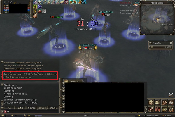 Посмотрел воочию, в общем Команду "синих" почти всех портует в вводу на "Арене Хаоса" (на Грации). И... арена не ПВП, без "флага" бой не начать, уверен что зона не боевая и можно как и прежде схватить ПК.